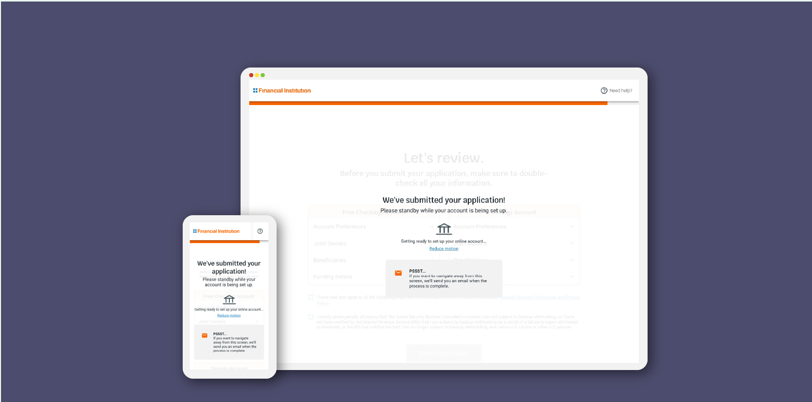 Our product had an interesting problem to solve: How do you let a user know that their application is loading, while also letting them know they can navigate away from the page? The main challenge for me with this bit of interaction design is that we had to meet accessibility criteria for users who might be sensitive to motion, while also letting an animation run indefinitely, since the backend process could take anywhere from 20 seconds to 8 minutes. It was really fun to work with the design and engineering team as the bridge between the two. The prototypes I created also helped us test out quick ideas without committing to a full integration in production code and gave us something to test with users.