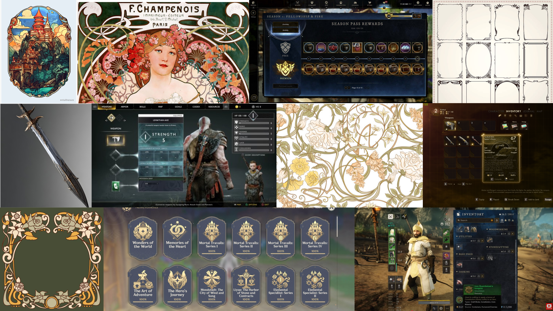My first pass has a definite New World aesthetic to it, with highly textured backgrounds and a darker tone to the UI colors. But I don't think I've really incorporated the art nouveau decorative elements yet, so I would like to do another pass.