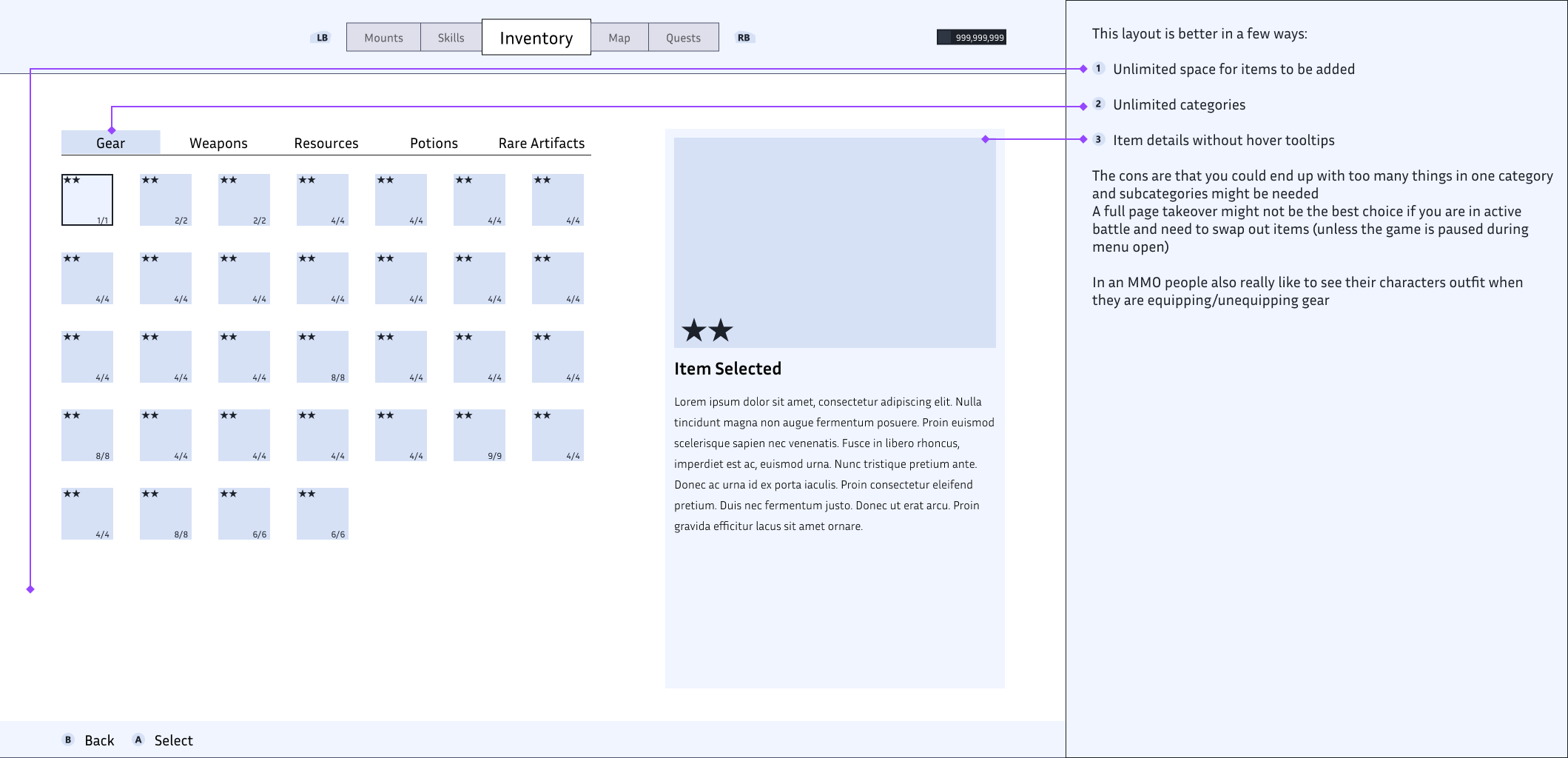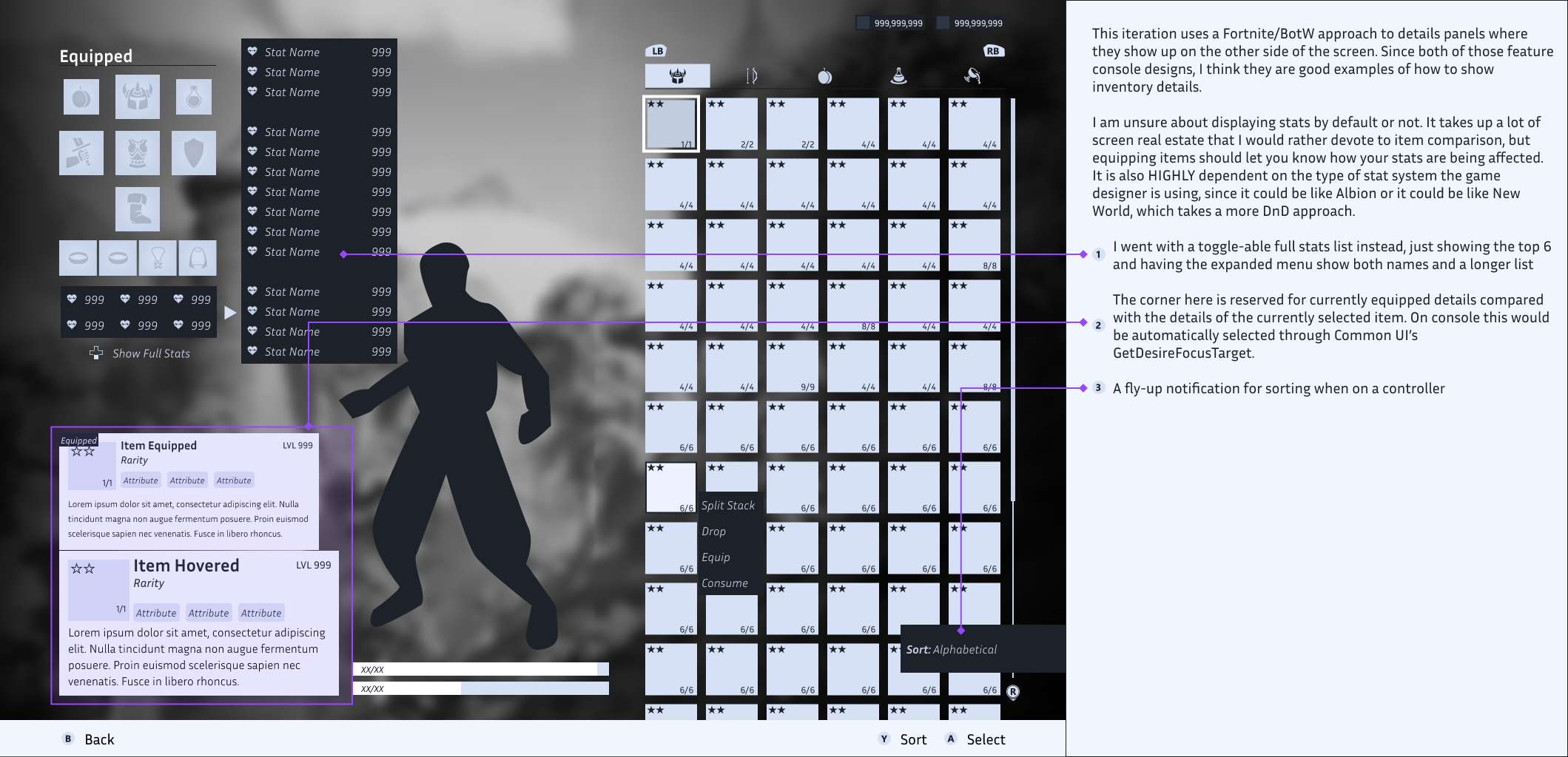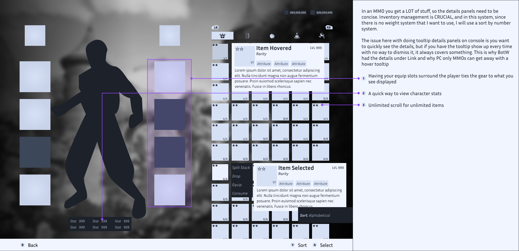 While wireframing, I had to think really hard about the balance between item details, stats, and character visibility. Many MMOs will let you open the inventory while still viewing the character, since most players like to see items get equipped to see what they look like.